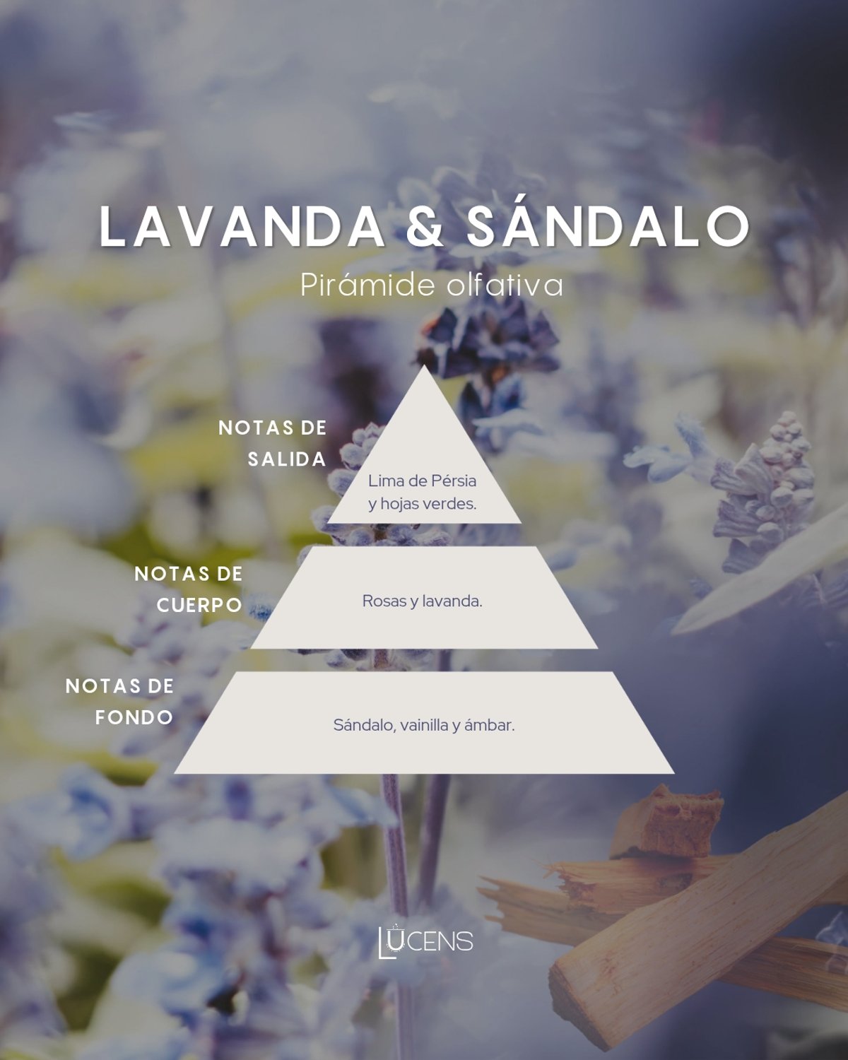 La fragancia se abre con una apertura fresca y reconfortante, con notas cítricas de lima persa combinadas con la frescura de hojas verdes, creando una primera impresión energizante y acogedora. En el corazón, la lavanda se mezcla con la rosa, formando una elegante fusión floral que transmite una sensación de serenidad y armonía. La base de sándalo, vainilla y ámbar añade una profundidad cálida y envolvente, haciendo que esta fragancia sea perfecta para crear una atmósfera tranquila, acogedora y sofisticada.